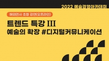 코엑스 3층 컨퍼런스룸에서 진행되는 이번 특강에서는 문화예술 분야의 디지털 트렌드를 분석하고 현장에서 활용할 수 있는 디지털 커뮤니케이션의 방법과 사례를 공유한다. 아울러 아트와 테크놀로지를 활용하여 MZ세대를 중심으로 확대되고 있는 미술 소비자에 대응할 수 있는 전략 또한 알아본다.