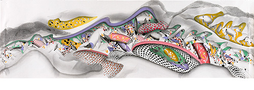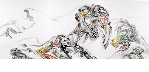 한상호의 산수에는 가끔 구름이 등장한다. 산꼭대기를 지나치듯 무심히 떠 있기도 하고 산중턱에 맞닥뜨려지기도 한다. 이 구름은 촘촘한 점과 화사한 색채로 이루어져 있다. 고분벽화의 구름을 연상시키지만 실상 고구려 고분벽화의 구름은 선으로 이루어져 있고, 백제고분의 구름은 흰 연꽃처럼 휘몰아치는 것이 일반적이다. 벽화에서 차용한 이미지가 아닌 단청과 같은 색층으로 나타낸 작가 특유의 도상인 것이다. 이 무거운 구름이 걸려 있는 산을 보노라면 분명 조형적 완성보다는 작가가 심상에 호소하는 감각적인 세계에 탐닉하고 있다는 생각이 든다. 무게를 갖지 않는 구름이 정작 무거운 이유에 대해 고구하게 되는 것이다. 그러고보니 구름만큼 변화무쌍하고 상대를 변화시키는 존재도 없을 성 싶다. 구름의 외적인 형상이 아니라 그에 포함된 기의 흐름 그 엄청난 힘에 대해 말하고 있는 것이다. 그렇게 사물을 에너지로 인식할 때 우리가 갖는 자연의 무게는 사뭇 다르게 느껴질 것이다. 결국 명징한 산수는 그 힘의 무게 배분에 의해 재해석된 자연임을 깨닫게 되는 것이다.