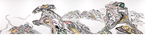 지난 해의 개인전 이후 한상호는 이 점을 더욱 확대, 강화시켰다. 500호가 넘는 산수에서 정작 눈을 두게 되는 것은 그 소(疏)하고 밀(密)한 포치의 한 국면에 불과한 점들의 집합이다. 큰 붓을 휘둘러 산의 뼈를 형성하고 그 뼈가 되는 곳의 깊은 곳이나 전면에 점들이 있다. 동글동글하여 모든 선과 면의 기본 단위가 되는 이 점들은 일정간격을 지니고 있어 내게는 컴퓨터 화상의 기초인 도트로 보인다. 현실계에서 다양한 점들이 일획인 것처럼 가상의 세계에서는 그 동글동글한 망점들이 화면의 기초로 인식된다. 컴퓨터와 결코 친하지 않은 작가가 선택한 전통에 반하기 위한 방식은 현대적인 표현기법의 표상을 취한 셈이 되었다. 결국 “그림이란 것은 인간세상의 돌아가는 모습의 큰 법이요, 산천의 모습과 정화로운 피어남이요, 예로부터 지금까지 천지를 창생하는 기의 조화요, 음양의 기상의 큰 흐름이다”라는 석도의 화론이 오늘날도 유용함을 확인하게 된다. 전통을 따르든 반전통을 획책하든이든 결국 진정한 그림은 화면에 인간세상의 돌아가는 흐름을 담고 있다. 한상호가 택한 반전통의 점은 비전통적인 것으로 보이지만 결국 인간사를 담는 그릇으로서 그림을 성립하는 요소가 되는 것이다.