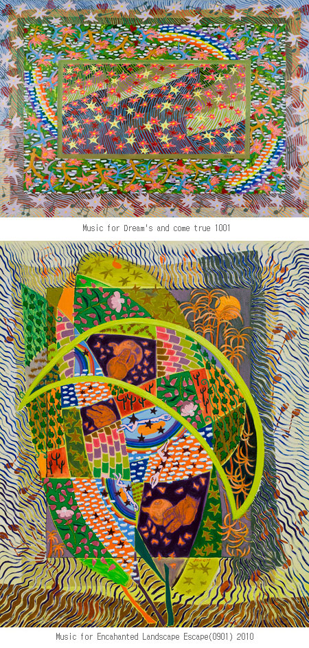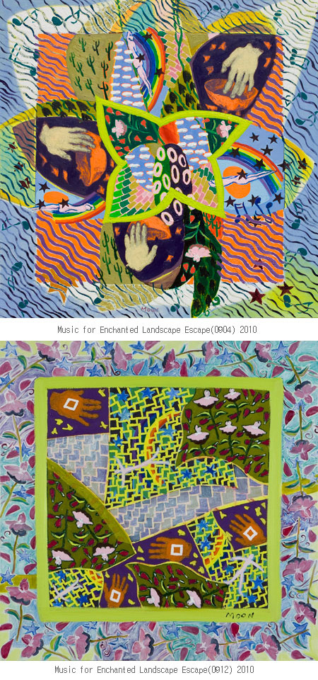 근작에서는 작가의 회화의 음악적 접목과 여러 패턴의 연동을 좀더 분명히 목격할 수 있다. 음파같이 출렁이는 물결 위로 음표가 떠다니는 모습과 점박이 포인세티아, 종소리, 총총한 별들, 공간을 배회하는 새들, 도움을 요청하는 갈급한 손, 연둣빛 들풀, 희생을 추모하는 무희의 이미지 등등. 그 외에도 모종의 비밀을 간직한 듯한 주사위, 마차, 나무,전화기, 여인, 양떼, 꽃송이, 어스름한 달빛 등과도 조우할 수 있다. 그의 캔버스는 온통 총천연색의 이미지들로 가득차 있는데 매우 칼라플하고 장식적이다. 네모의 캔버스를 다시 정방형으로 나누고 그 안을 다시 조그만 면으로 잘게 구획하여 이미지를 채워간다. 이미지를 넣을 때도 있고 장식적 패턴으로 충당할 때도 있다.