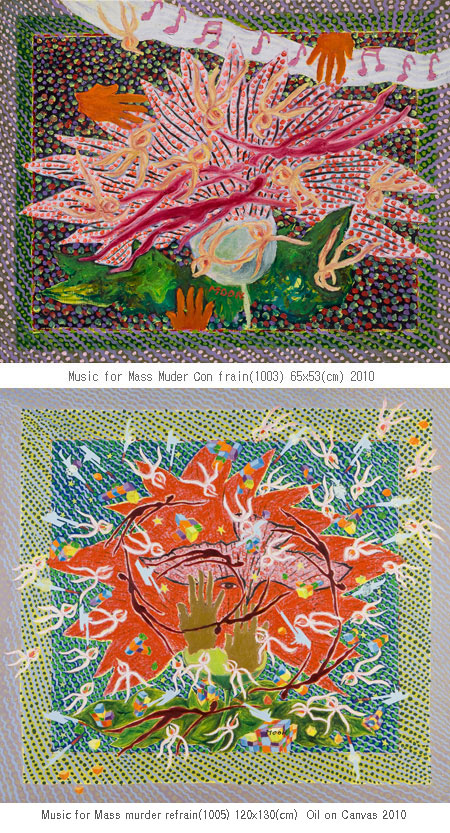 (2010)가 그러하다. 원래 이 작품은 세계대전때 무참하게 죽어간 유대인들을 기릴 계획이었으나 공교롭게도 같은 기간 천안함 참사로 인해 목숨을 잃은 꽃같은 젊은 장병들의 죽음을 추모하는 것으로 내용을 바꾸었다고 한다. 북한의 도발로 수십명의 영혼이 적막한 심해의 바다속에 잠들어버렸고 안타깝게도 그들의 꿈마저 앗아가 버렸다. 음악으로 치면 레퀴엠에 비교할 수 있는 이 그림에서 아무런 죽음의 냄새도 느낄 수 없는 것은 그들의 희생을 더없이 고결하고 아름답게 바라보았기 때문이다. 군무를 추듯 시신들이 별 주위를 떠돌고 분홍,파랑,노랑의 색깔과 장식성높은 패턴들이 이들을 떠받치고 있다. 조국을 위한 희생만큼 고귀한 삶이 어디 있겠는가. 그림에서 이들은 별들처럼 찬란하고 새처럼 자유로우며 무지개만치 아름다운 존재로 묘사되고 있다. 작가는 비통한 심정으로 그들의 죽음을 슬퍼하며 이제는 하늘나라로 향하는 이들의 길을 축복하기 위해 화면에 꽃을 깔아놓는 것도 잊지 않았다. 청년들의 고귀한 죽음에 깊은 애도를 표하며 거기에 담긴 의미를 예술로 승화시킨 역사적인 작품이다.