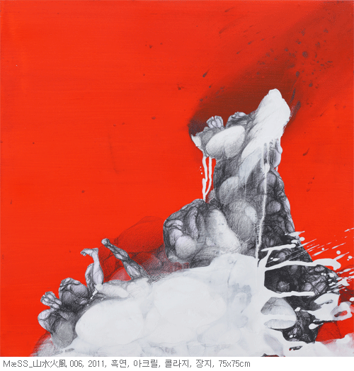 불의 정신분석 2010년까지 선 보였던 MæSS 연작이 주로 ‘한 덩어리 의식’이라는 주제에 초점을 맞춰 인간과 자연의 공생관계를 생성, 소멸, 변화, 순환하는 우주자연의 기본 원리에 입각하여 시각조형언어로서 탐구하였다면, 이번 MæSS_山水火風 연작은 이러한 사상을 근간으로 하되 地. 水. 火. 風이라는 사대요소를 도입하여 각 요소를 인간의 본성과 연계하여 좀 더 정신분석학적 측면에서 접근하고자 하였다. 예를 들어, 이번 작업에서의 두드러진 변화는 붉은 색의 전면적 사용이다. 붉은 색은 불과 열을 의미한다. 체온이 일정 수준 이하 또는 이상일 경우 인간은 죽는다. 그러므로 열은 실체의 풍부함과 영속성을 말해주는 대표적인 증거이자 생의 강도, 존재의 강도를 파악할 수 있는 척도이다. 불은 인간의 감정 중 뜨거운 감정, 즉 본능, 욕망, 욕구 등과 관련이 있다. 무언가 원초적인 것과 현실적인 것과의 충돌이 존재한다. 10여 년간의 외지에서의 삶을 접고 귀국한 지 어느새 2년. 물리적 공간의 이동은 심리적, 정신적 변화를 필연적으로 수반하고, 이로 인한 또 한 번의 내적 혼란과 분열, 그리고 재귀현상을 체험한다. 마치 오랜 시간 사유공간에서 떠돌다가 이제야 비로소 땅에 발이 맞닿는 현실공간으로 들어 온 느낌이다.